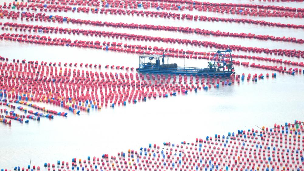 O fermă marină din prefectura Xiapu, provincia Fujian, prezintă o imagine deosebită. Bărcile de pescuit navighează printre balizele colorate care plutesc pe luciul mării unde este cultivat varec.