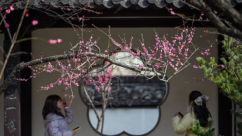 Turiștii se plimbă într-o grădină clasică, sub florile de prun. (Foto: CFP)